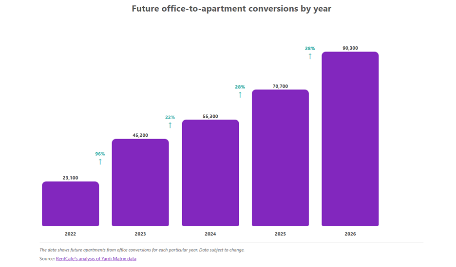 A record 90,000 apartments are now in the U.S. pipeline of office-to-apartment conversions, according to RentCafe’s latest analysis of Yardi data – a sign that each year shifts adaptive reuse even more from niche strategy to mainstream development tool. The surge comes as office vacancy persists under hybrid work and housing demand remains strong in supply-constrained cities.